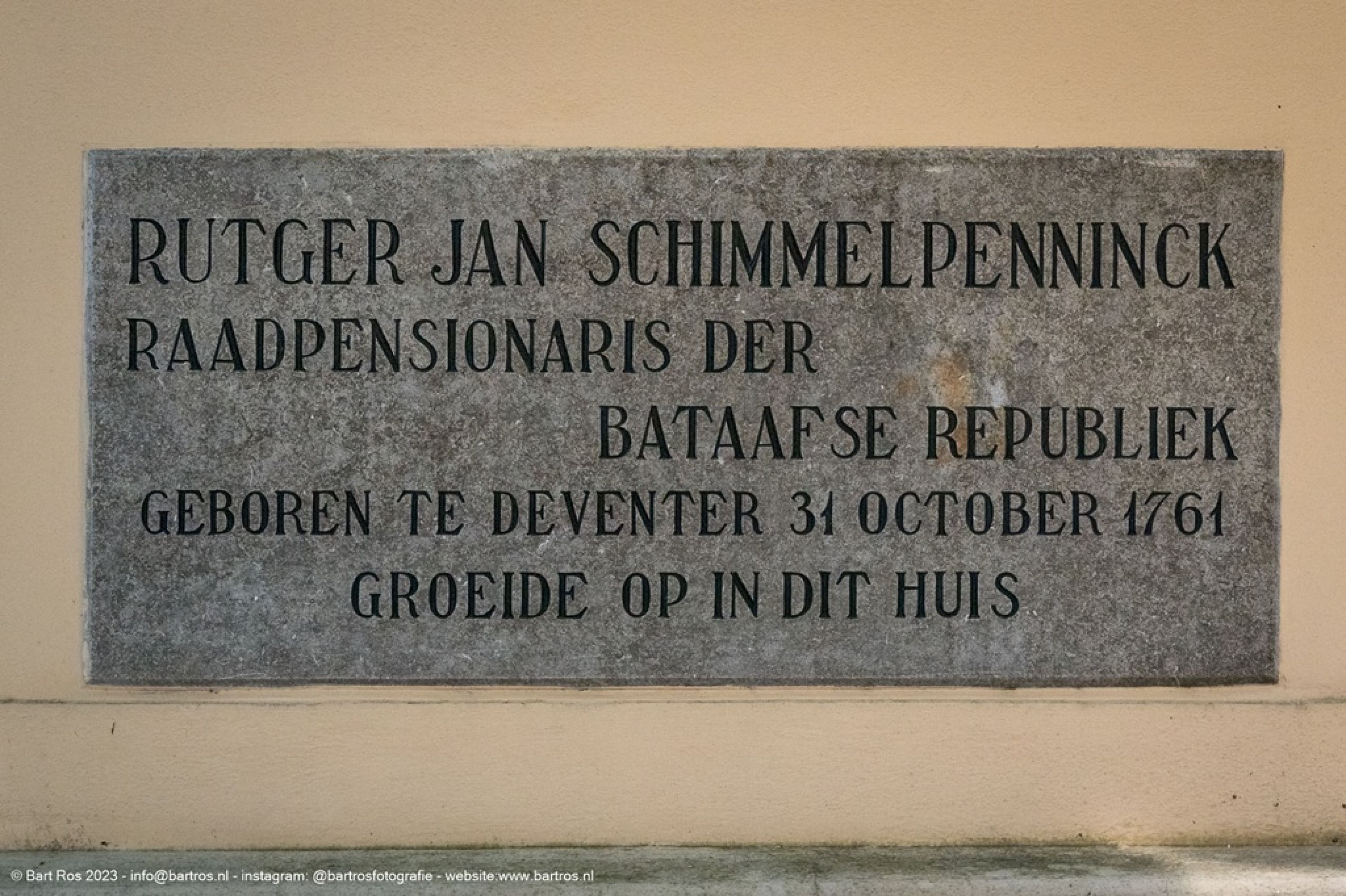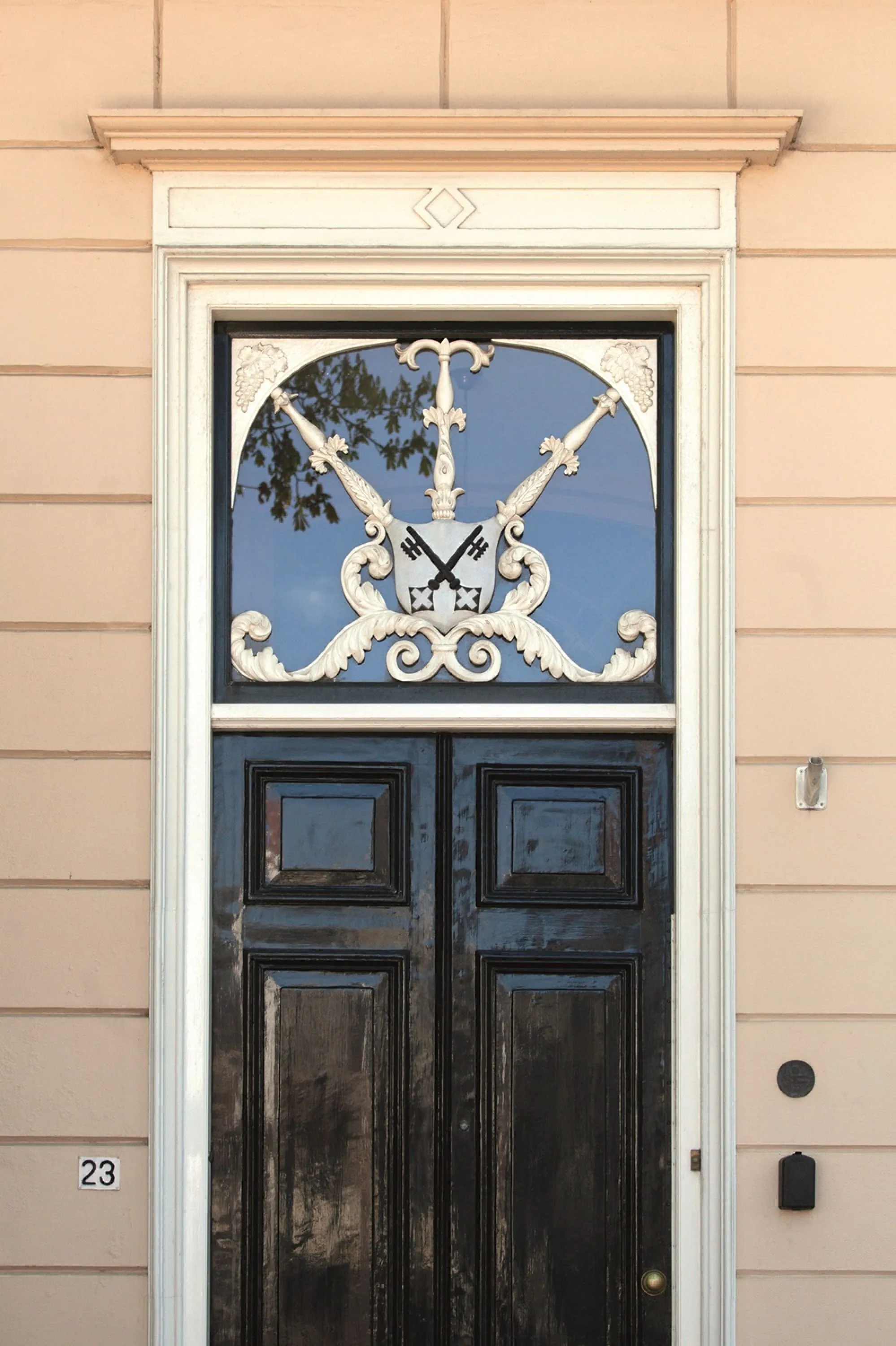 Het snijraam met familiewapen boven de voordeur van de Deventer kunstenares Ela Venbroek geeft op subtiele wijze de connectie tussen de familie Schimmelpenninck en de wijnhandel weer: de druiventrossen links en rechtsboven. Het familiewapen kent o.a. twee schuin gekruiste blauwe sleutels in een blauw vrijkwartier en een gouden handspiegel waaromheen zich een zilveren slang kronkelt.