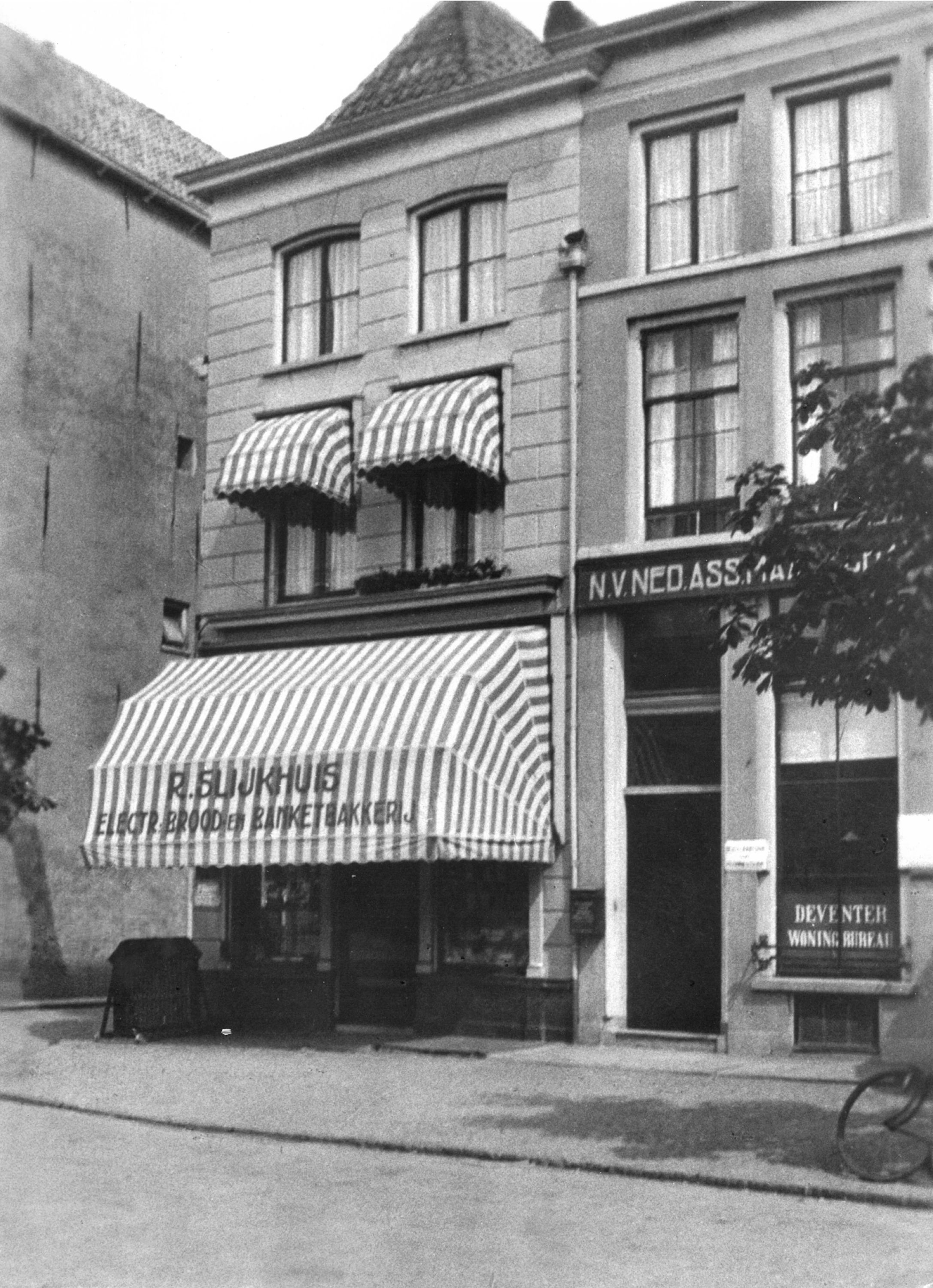In 1899 liet A.J. Slijkhuis dit pand verbouwen tot bakkerij. Bij de restauratie van 1979 bleef de winkelpui intact. Drie identieke snijramen geven dit huis aan de Brinkzijde een harmonieus aanzien. In de bakkerij van Slijkhuis kwamen de boeren uit de wijde omgeving hun roggebroden halen, de zogenaamde achtponders.