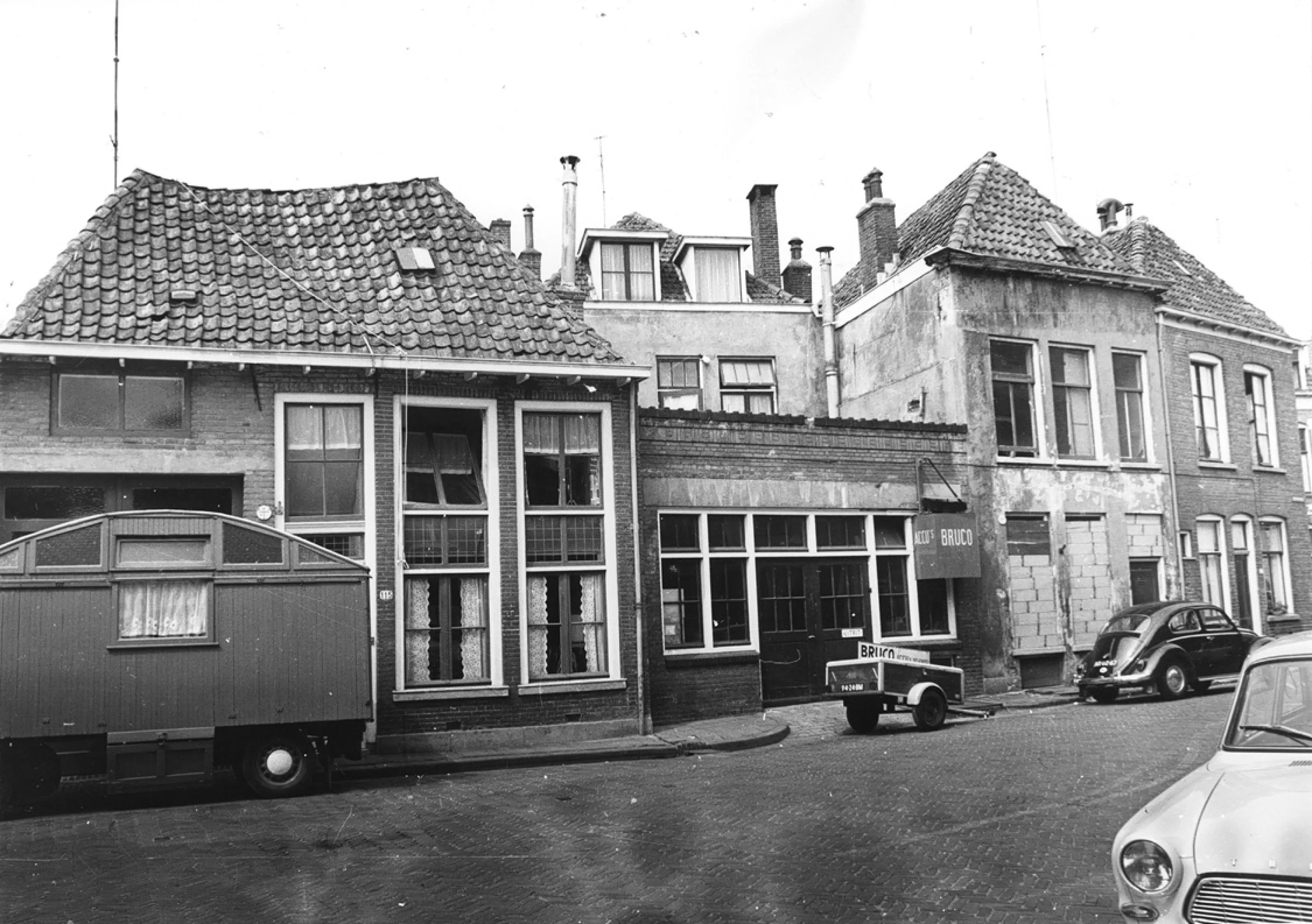 Waar Papenstraat en Noordenbergstraat bijeenkomen, stond dit ondiepe huis dat als pakhuis heeft gediend, maar ook als woning voor arme gezinnen. Van lieverlee vestigden zich kleine bedrijfjes in dit soort huisjes. Zo verbreedde E. Polak in 1924 zijn deur naar de Noordenbergstraat en in 1951 werden grote garagedeuren aangebracht, een laatste klap die het huisje deed wankelen.