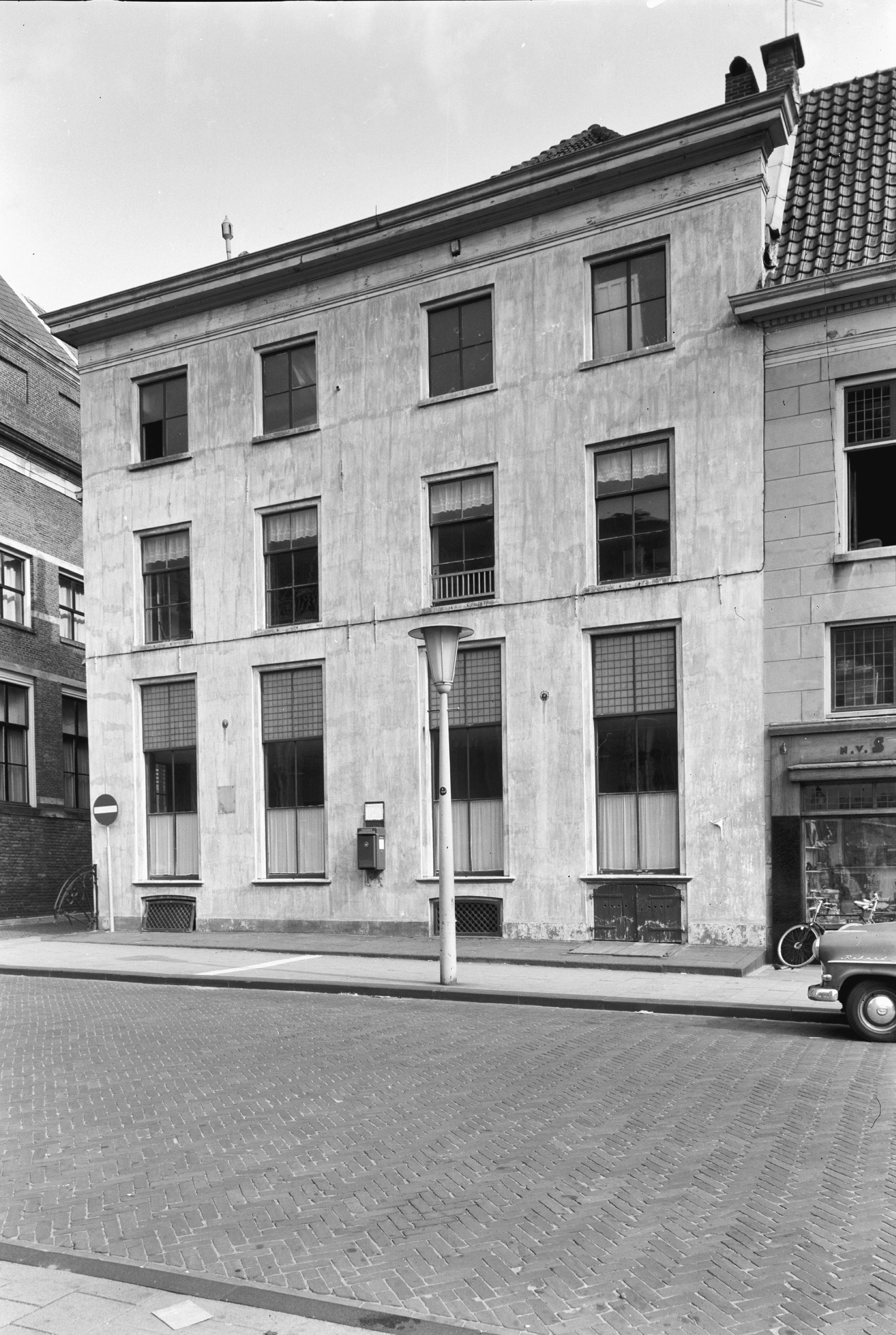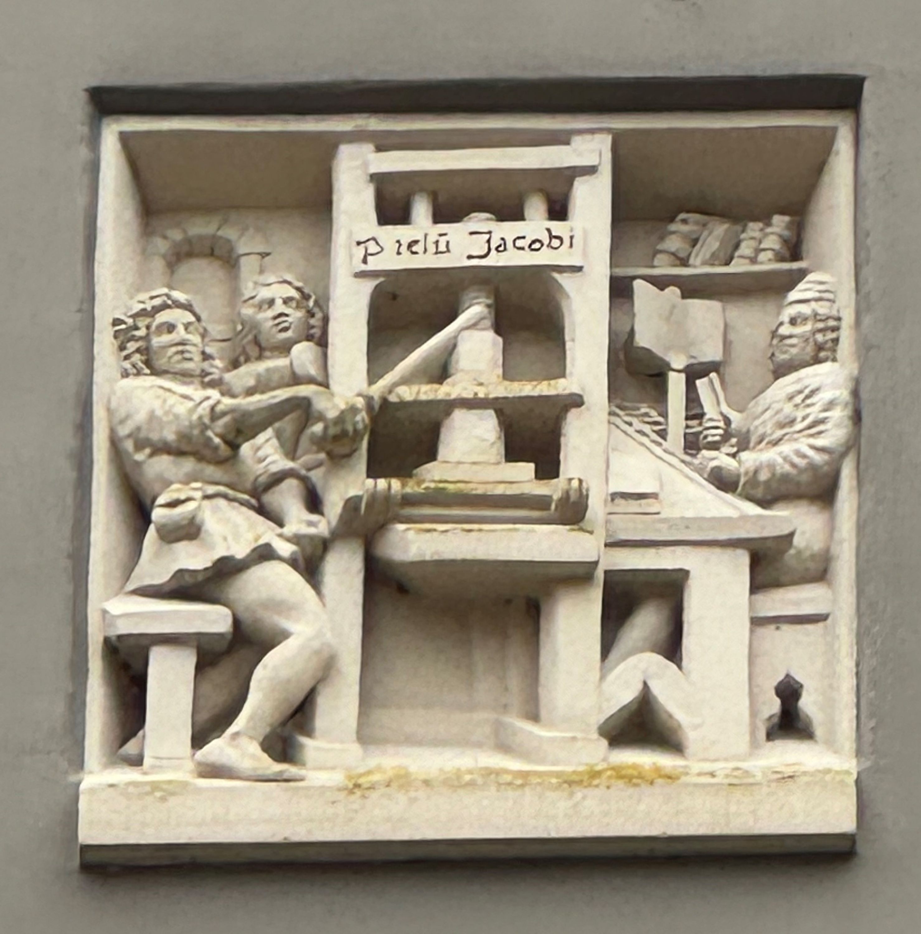 Uit archieven bleek dat het rechterhuis op het Grote Kerkhof in 1511 werd gekoppeld aan het hoekhuis en dat hun beider uitgang sindsdien aan de Polstraat lag. Jacob van Breda of Jacob de Prenter, zoals zijn beroepsnaam luidde, speelde vooral in op de vraag naar studieboeken. Zijn drukkersmerk, vervaardigd door Ton Mooy, siert de gevel. De kunstenaar was ook verantwoordelijk voor de ovale letterplaat waarvan de letters ontworpen werden door Gijs de Ouden en de spreukband "Bij den Salvator". Dat laatste verwijst naar de tijd dat het huidige plein nog als kerkhof werd gebruikt.
