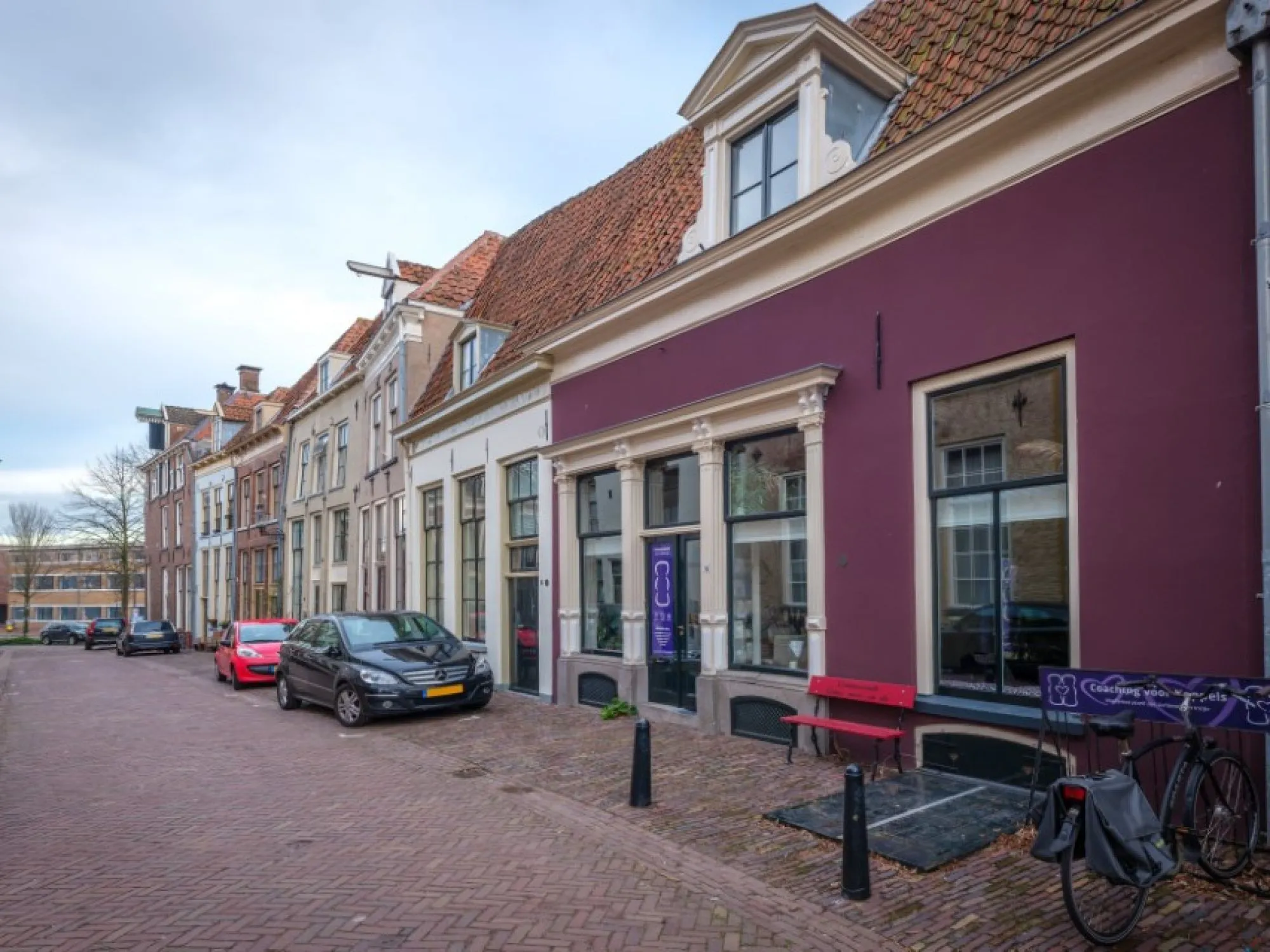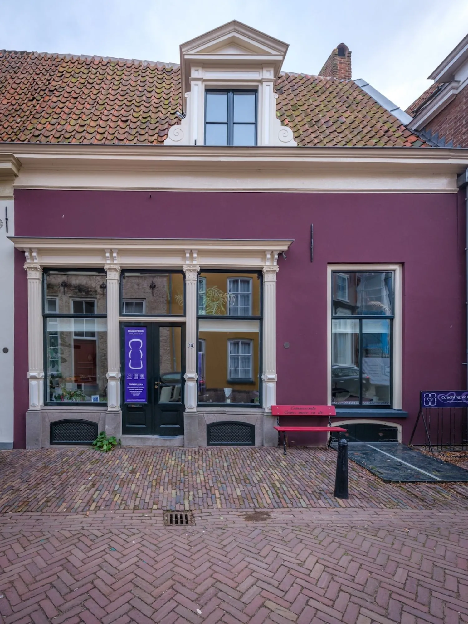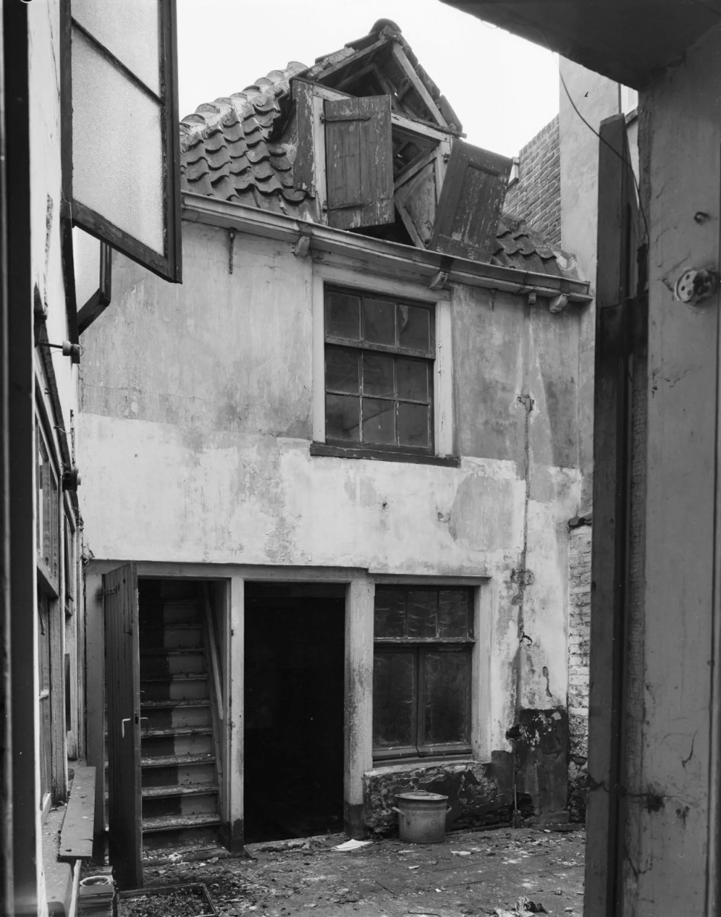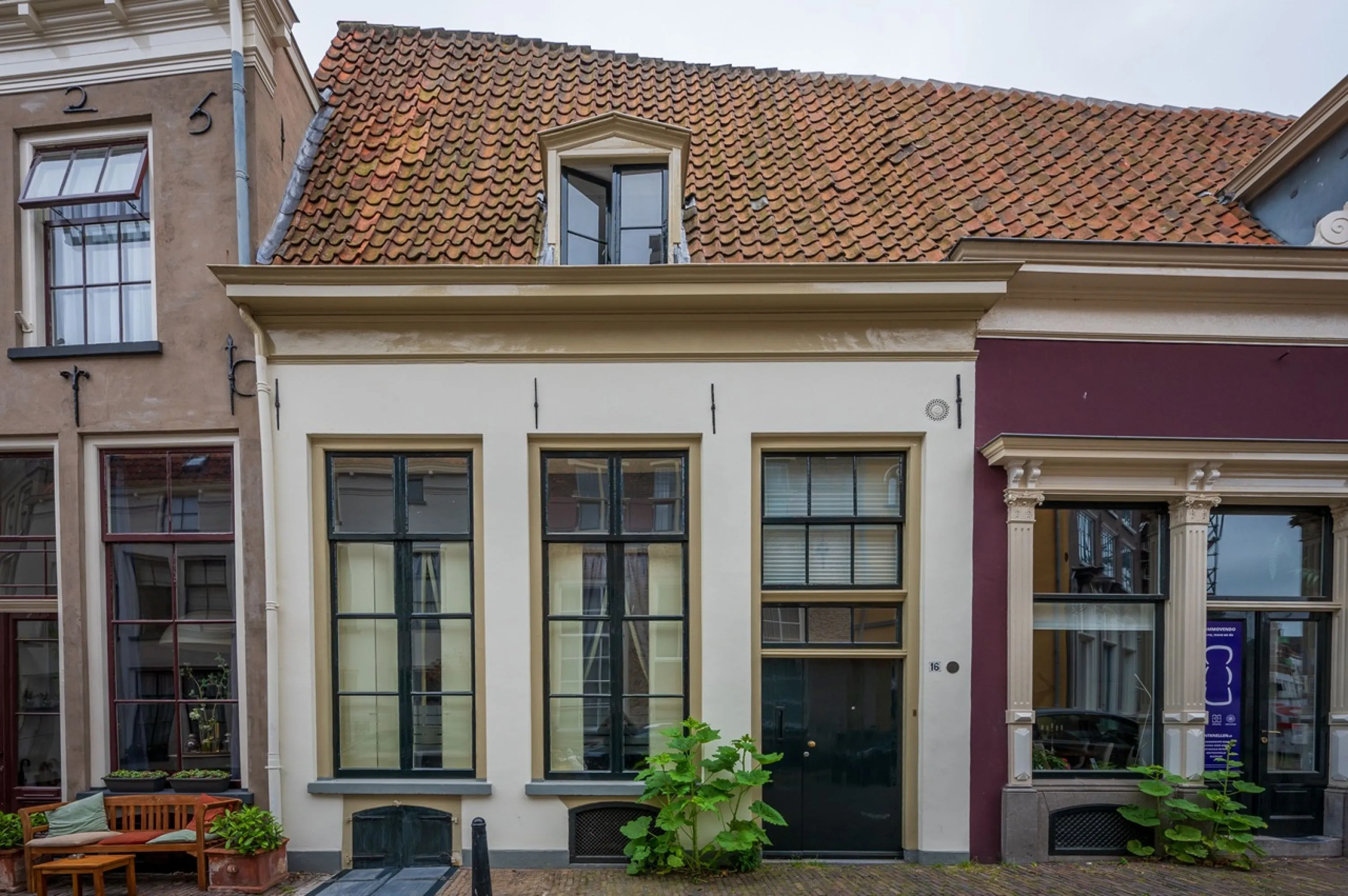 Het voorhuis is parellel aan de muur gebouwd en nr. 14 was met nr. 16 oorspronkelijk één huis dat later is gesplitst. De houten winkelpui dateert ui de vroege 20e eeuw, toen Regterschot hier zijn slagerij had.