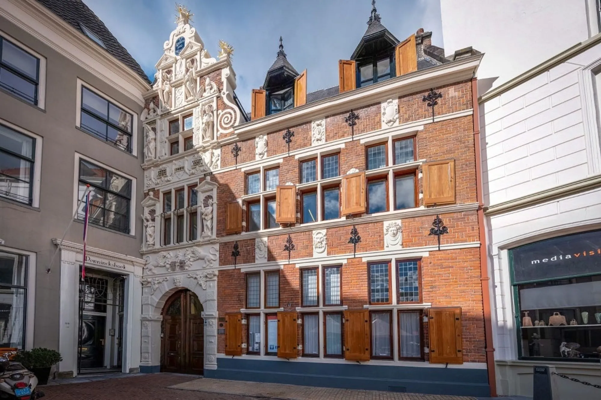 Op de gevel staat de wijze spreuk "Als Godt behaget-beter-benijt als beclaget". De rijk versierde gevel aan de Brinkzijde bevat zes beelden van allegorische vrouwenfiguren voorstellende de drie goddelijke deugden: Fides (geloof), Spes (hoop) en Charitas (liefde) en de drie kardinale (zedelijke) deugden. Prudentia (voorzichtigheid), Fortitudo (sterkte) en Temperantia (matigheid).