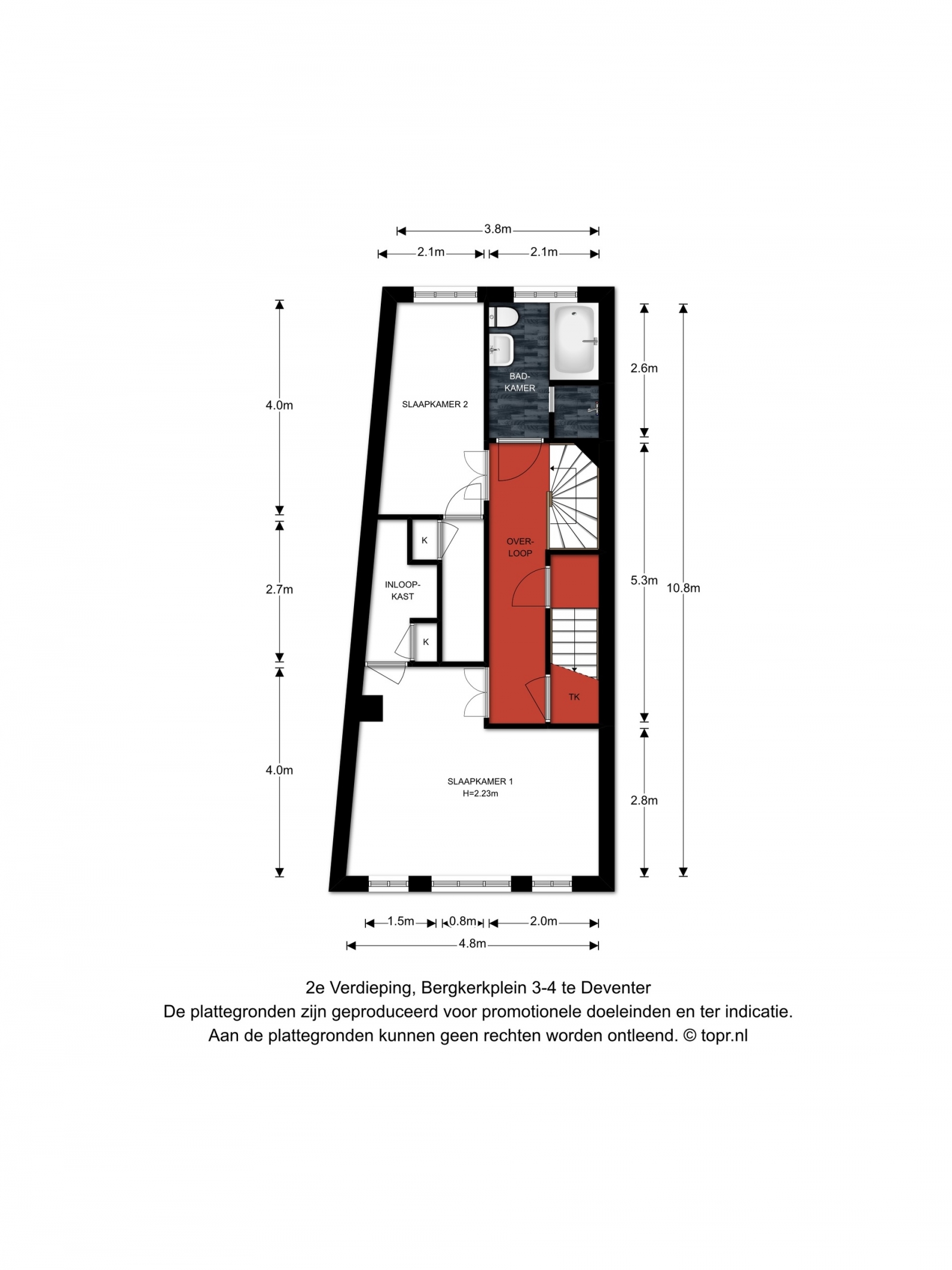 Op de tweede verdieping liggen twee slaapkamers met beide een diepe inloopkast en de badkamer met wastafel, toilet, ligbad en aparte douche.