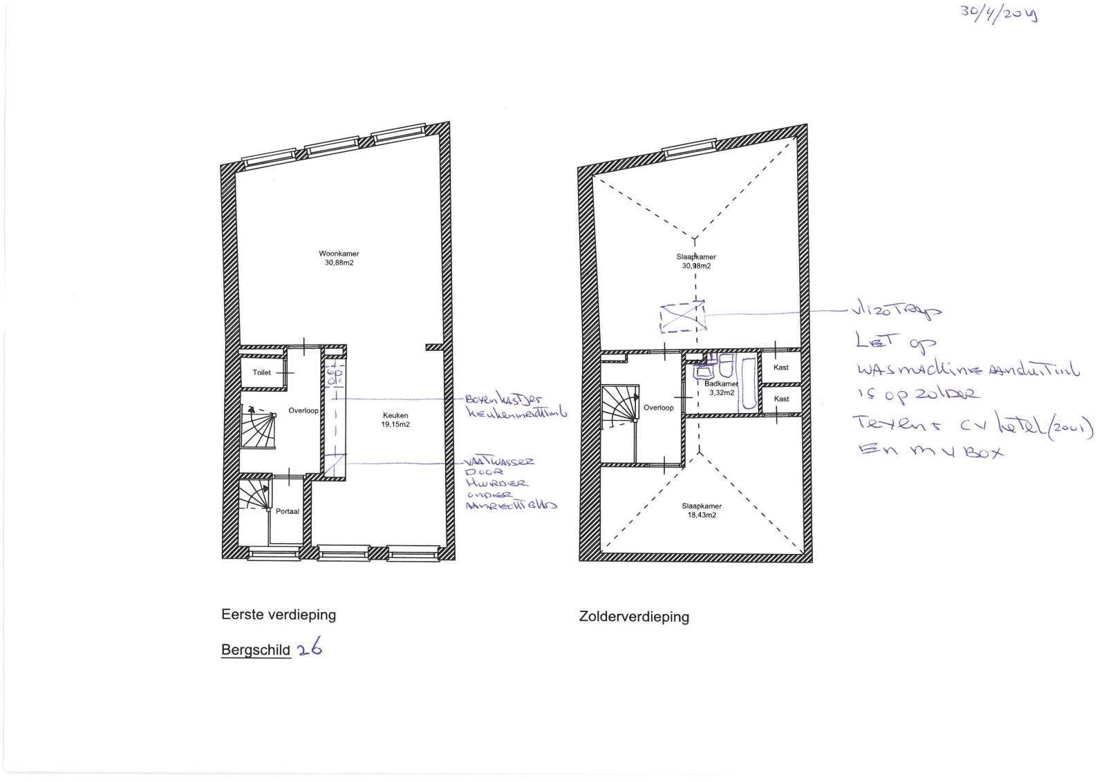 Op de verdieping bevinden zich 2 slaapkamers, groot ca 30 en 18 m2 met inbouwkasten.