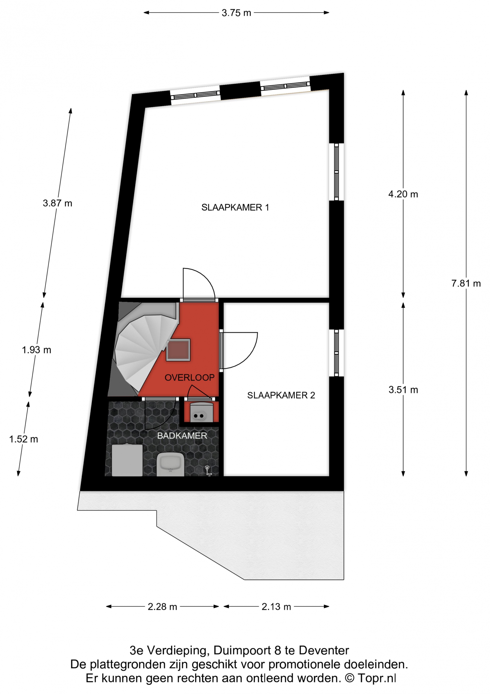 Bovenste verdieping: 2 slaapkamers ( ca. 16 en 7 m2), badkamer met douche, wastafel en aansluiting voor de wasmachine.