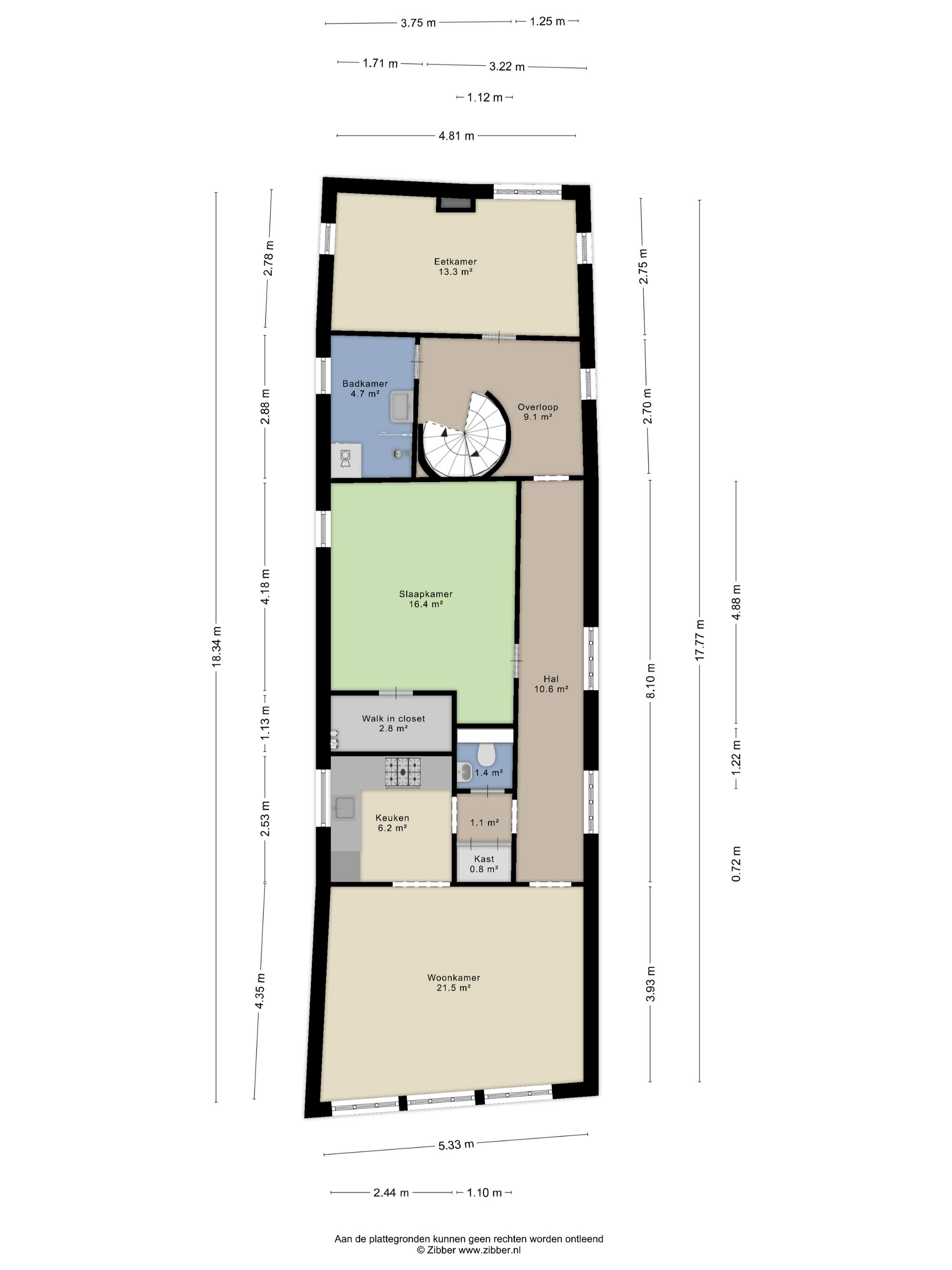 Op deze verdieping bevindt zich een hal met toegang tot de woonkamer aan de voorzijde van het pand met open keuken.