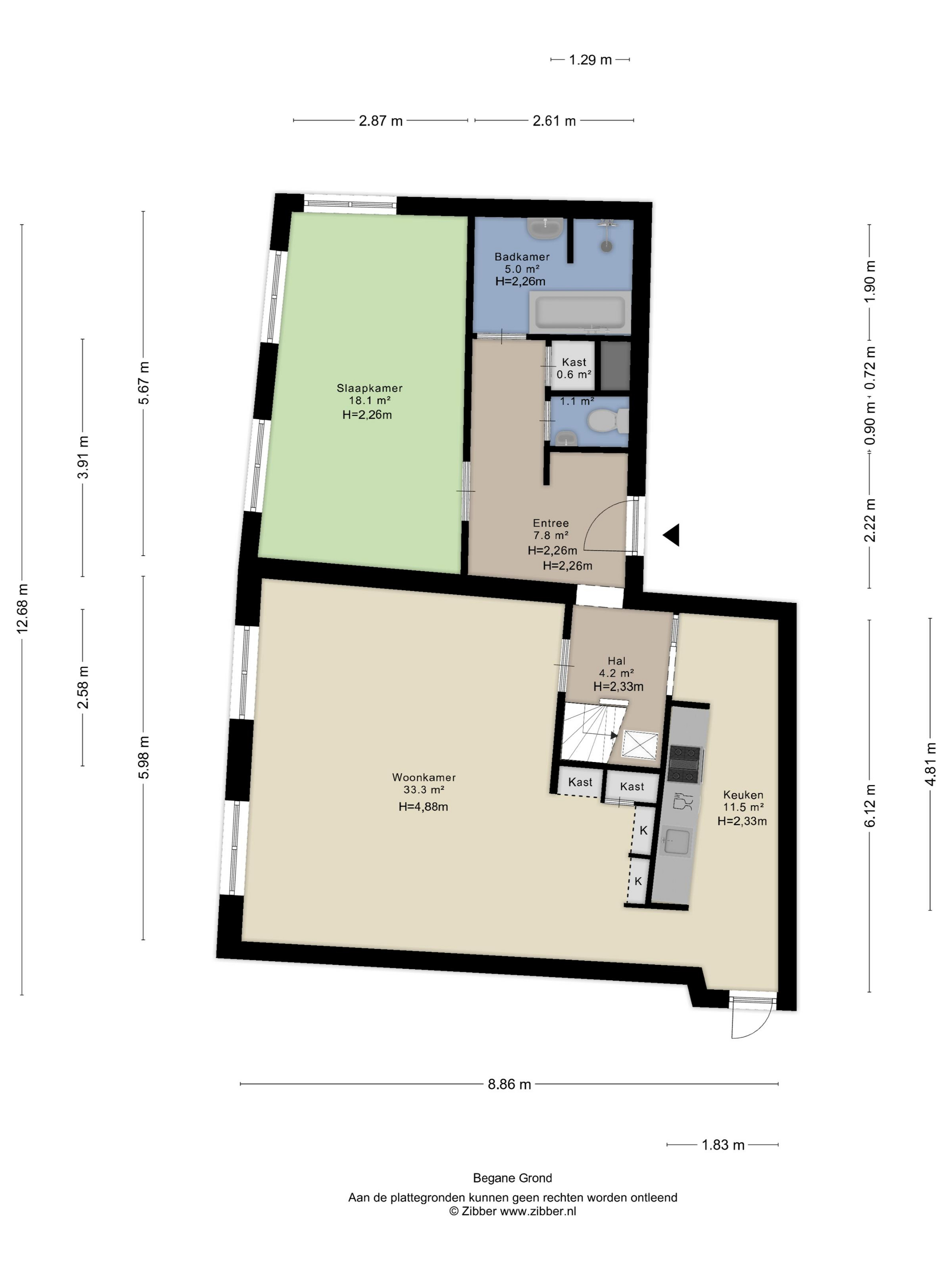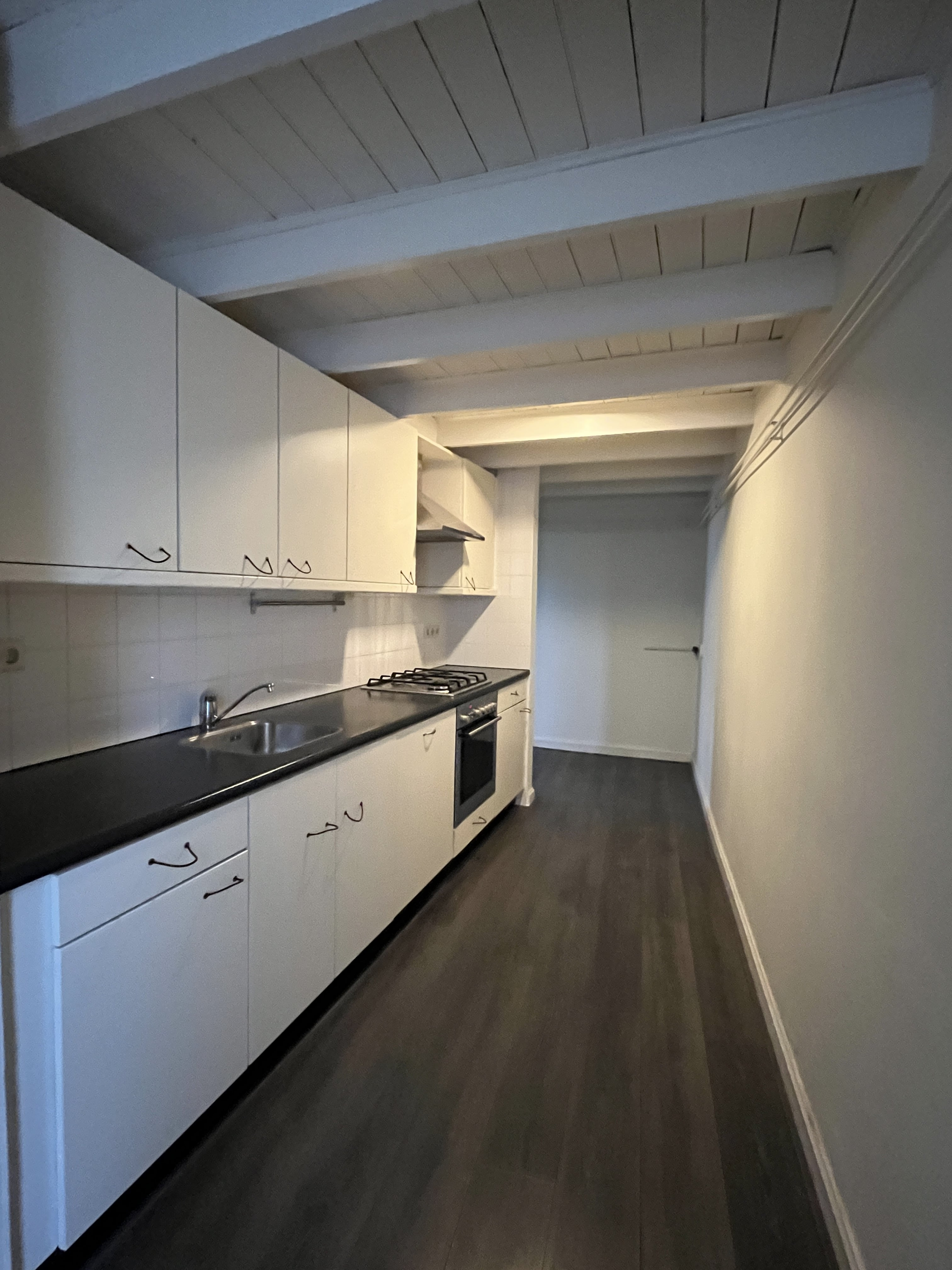 Hal, toilet, woonkamer met hoog plafond, half open keuken voorzien van inductiekookplaat, afzuigkap, koelkast, vaatwasser en combi-oven.