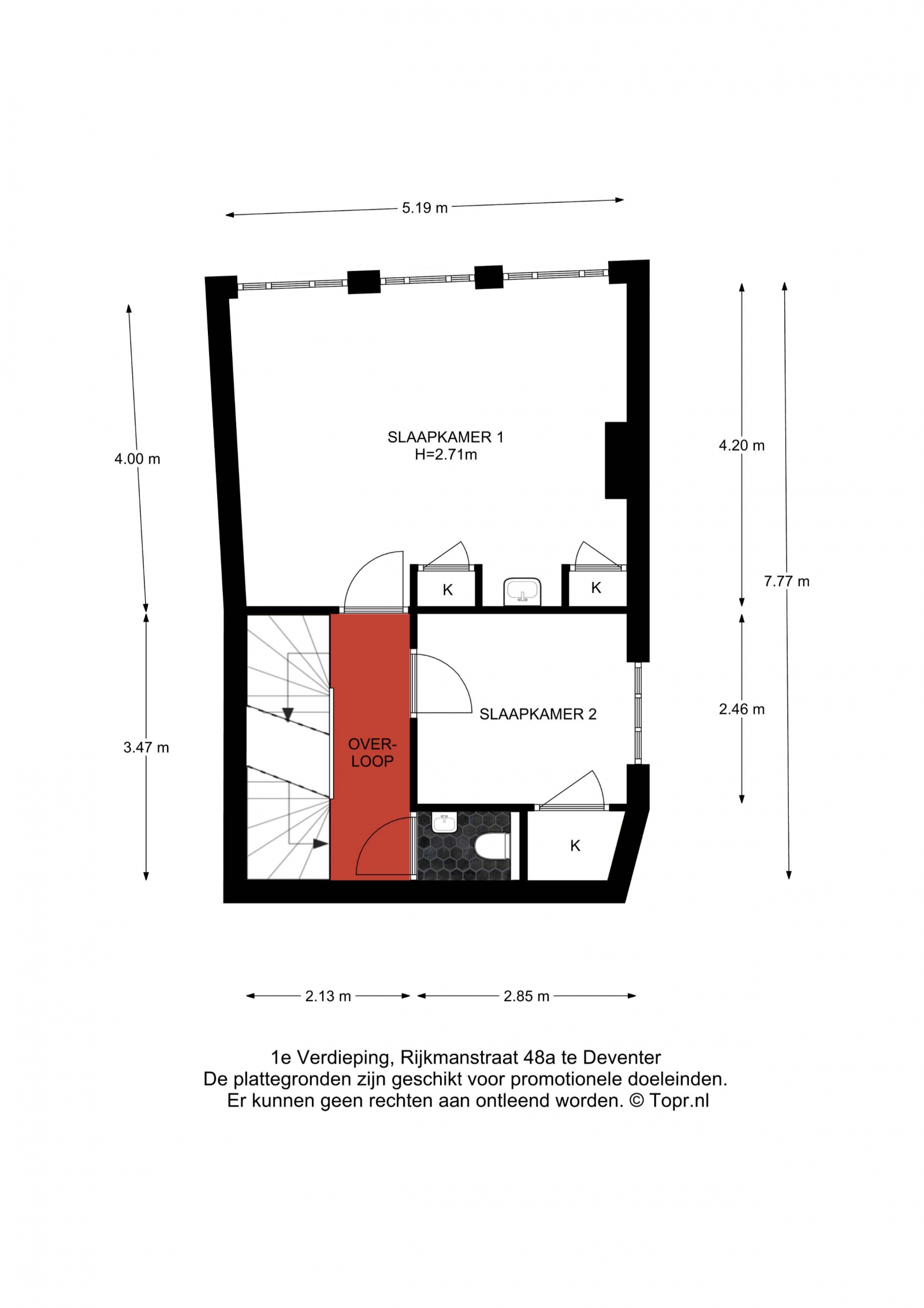 1e verdieping: twee slaapkamers, waarvan 1 ca. 21 m2. Beide slaapkamers zijn voorzien van inbouwkasten. 2e toilet.